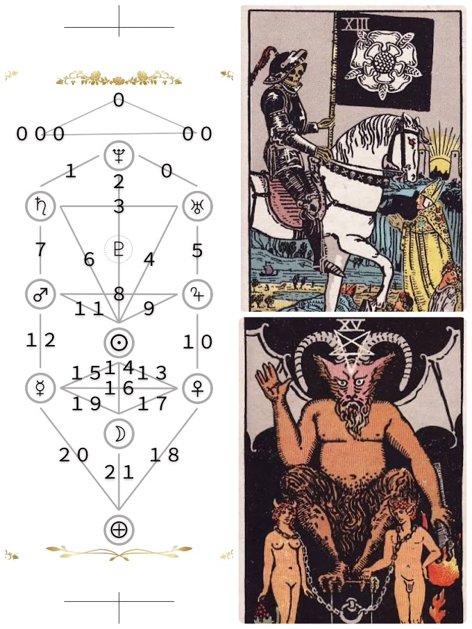 ※タロット13が死神で、タロット15が悪魔。13と15の上の星読みでいう太陽のマークが美。(14の天使は今回割愛します)