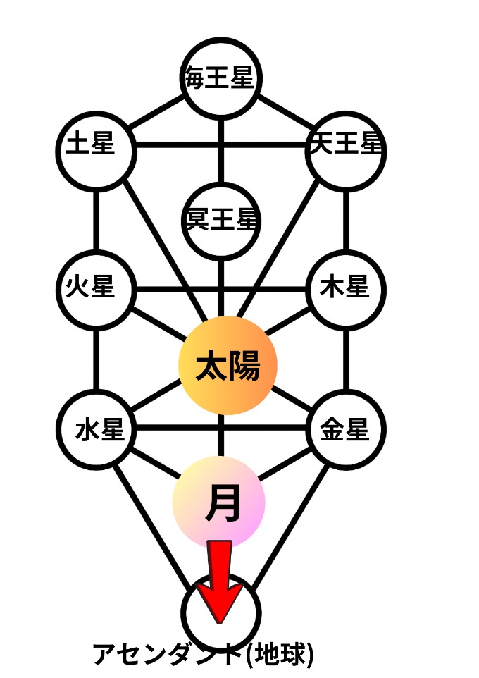 生命の樹では、物事が現実化・物質化するためのエネルギーが最後にイエソド(月)に集められて現実世界(マルクト、画像ではアセンダントの所)に送りこまれるとされています。ここが濁っていたらそのような現実が。ここが綺麗だとそのような現実が現象化するとされています。