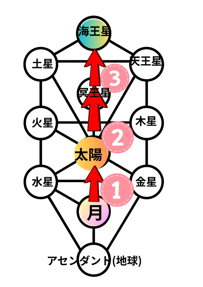 ①月意識から太陽意識へ→②太陽意識を生きる→③魂の目的を生きるフェーズへと段階を歩みます。(図の丸ピンク①〜③)