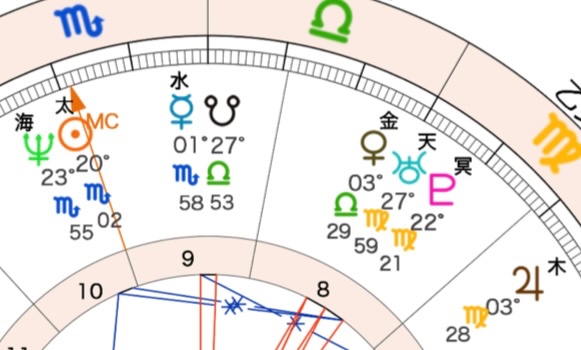 夢や直感を表す海王星が人生の目的をあらわす太陽と重なっています。インスピレーションでキャッチしたことを実行に移して自分の夢を叶えることができるでしょう。