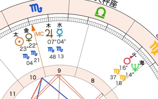 蠍座に天体(水星、木星、金星、太陽)が集まっています。