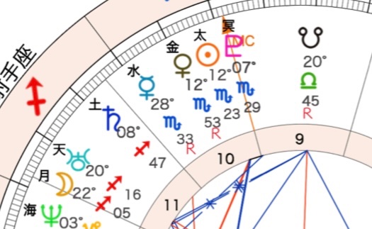 「蠍座」に天体(冥王星、太陽、金星、水星)が集まっています。鋭い洞察力で物事の本質を見抜くのが得意です。一見クールに見えますが、確固たる信念を内に秘めていますし、心の繋がりを強く求める人でしょう。