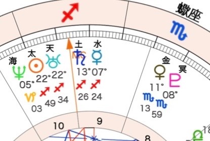 自分自身をあらわす太陽が、独自性をあらわす天王星と、広い視野をあらわす射手座で、ピッタリ重なっていますから、独自の人生観を持っていて、自分がこれだと決めた夢に向かって没頭し、まっすぐ突き進むことができる方なのかなと思います。