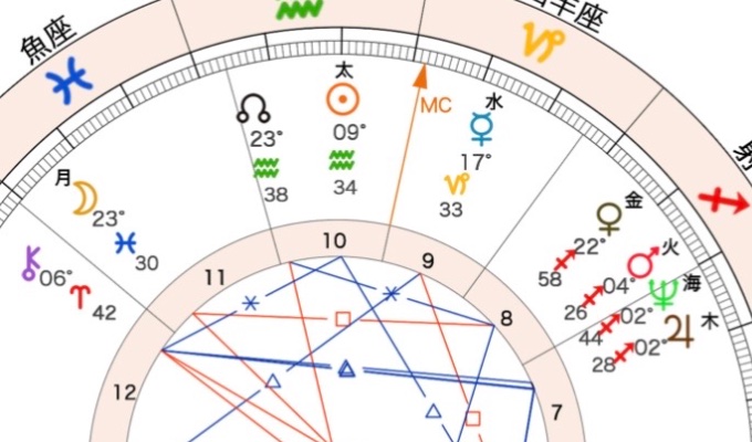 人生の目的や自分自身を表す「太陽」は、個性的で革新的、自由でフラットな考え方の「水瓶座」にあり。おおらかで広い視野、海外、冒険、そして自由を好む「射手座」に、天体が集まっています。「射手座」も「水瓶座」も「自由」というのがキーワードなんですね。