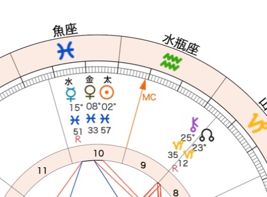 優しい世界観で、人とつながっていきたいというやさしさをもつ「水のエレメント」、そして周りに合わせて柔軟に変化し対応する「柔軟宮」が多めです。夢や幻想、思いやりや芸術的センスをあらわす「魚座」に、星が集まっています。