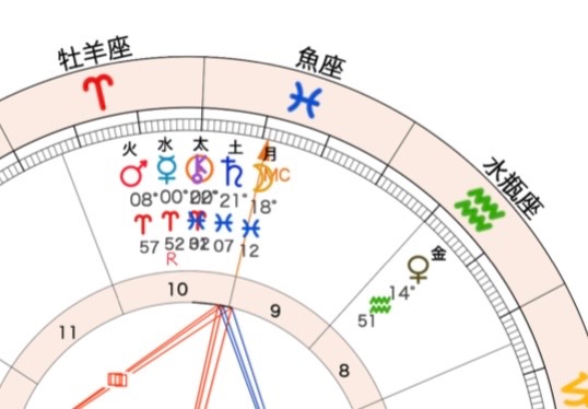 お昼の12時生まれと仮定すると、自分自身や人生の目的をあらわす「太陽」は、チャレンジ精神旺盛な「牡羊座」で、無意識の本音をあらわす「月」は、夢や幻想、芸術的才能をあらわす「魚座」です。強そうに見えて、案外ナイーブなところも持っている方なのかもしれませんね。