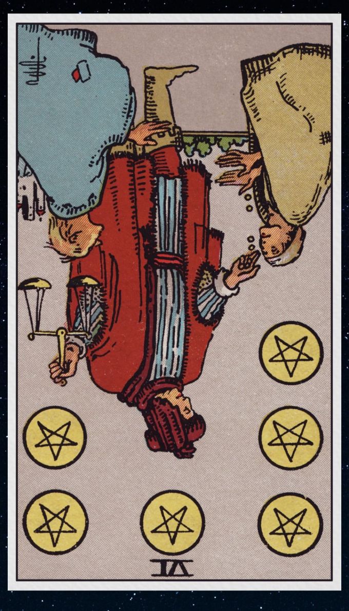 ペンタクル6の逆位置。不平等や利害不一致、偽善などを表すカードです。