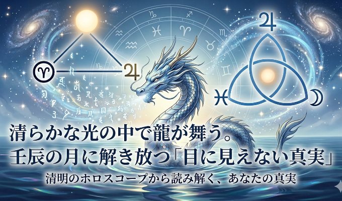 「壬辰(みずのえたつ)の月」が始まります。壬は「大きな海」、辰は「変容や躍動、龍」を象徴する干支。この一ヶ月は、まるで清らかな海から龍が勢いよく天へ昇るように、私たちの内側に眠る感情や才能が、ダイナミックに動き出すタイミングです。今回の清明のホロスコープは、非常に印象的です。まるで宇宙が、私たちに「隠された真実」を解き放つよう、静かに、けれど力強く促しているかのようです。
