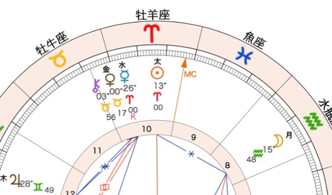 星座の性質から見てみると、全体的にバランスが良いですが、直感、情熱をあらわす「火のエレメント」、優れた行動力、指導力の「活動宮」、積極的でアクティブな「男性星座」が、少し多めです。人生の目的や自分自身をあらわす「太陽」は、勇猛果敢で新しく物事をスタートさせるパワーの強い「牡羊座」にあります。一見、バランス感覚の良いソフトな印象を与える人だけれど、強引なくらい行動的な方が本来の力を発揮しやすいのかもしれませんね。