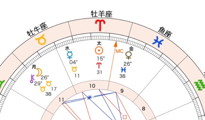 人生の目的や自分自身をあらわす「太陽」は、突き進むパワーの強い「牡羊座」に。無意識の本音をあらわす「月」は、温厚で粘り強い「牡牛座」にあります。情熱は内に秘め、着実に目的を達成するタイプかもしれませんね。