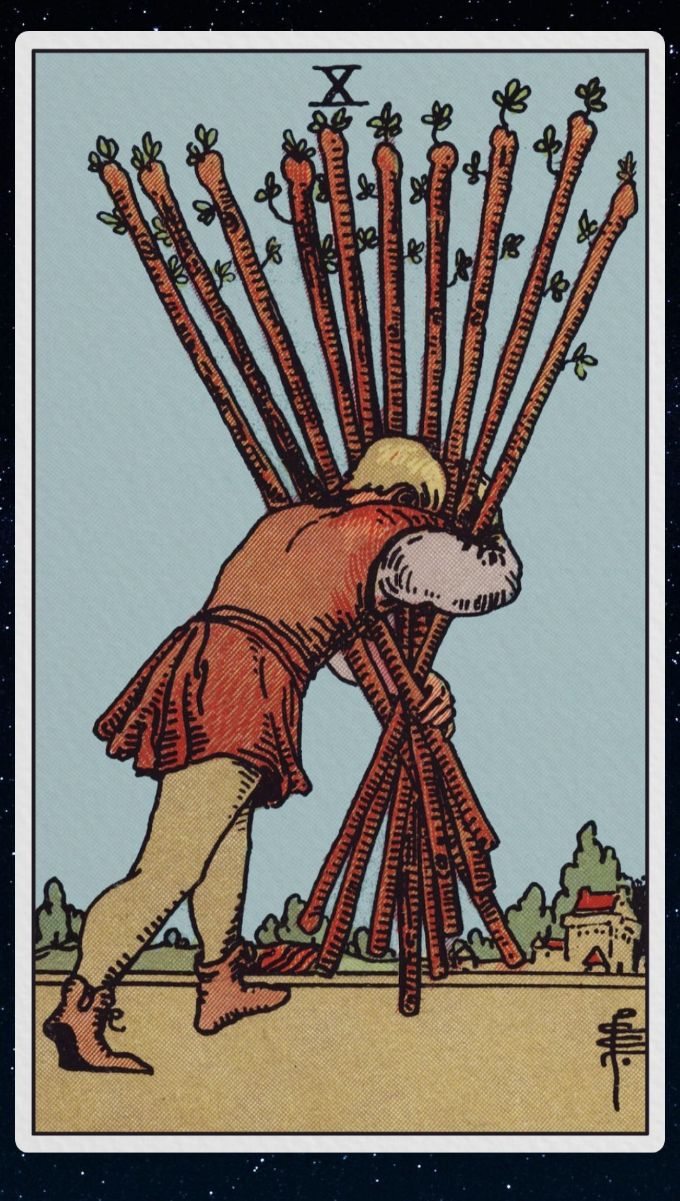 昨日に引き続いての10です。数字の10は完成や完結などひとつのゴールを意味しますが、ワンドにおいては抱え過ぎていっぱいいっぱいな様子が描かれています。
